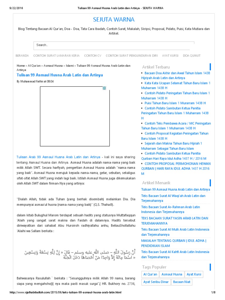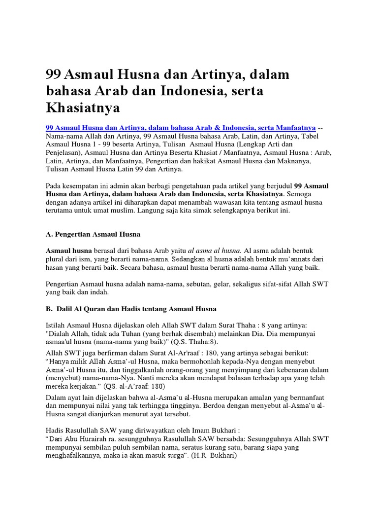 Atau barangkali ada yang belum lancar membaca tulisan arab bisa sangat dibantu dengan kehadiran bacaan versi latinnya. Tujuannya untuk memperjelas bacaan nama asmaul husnanya. More images for teks asmaul husna latin saja » Dec 21, 2018 · 99 asmaul husna arab, latin dan artinya. Selain itu, tulisan arab asmaul husna yang kami rangkum sudah dilengkapi dengan syakat atau harakat.